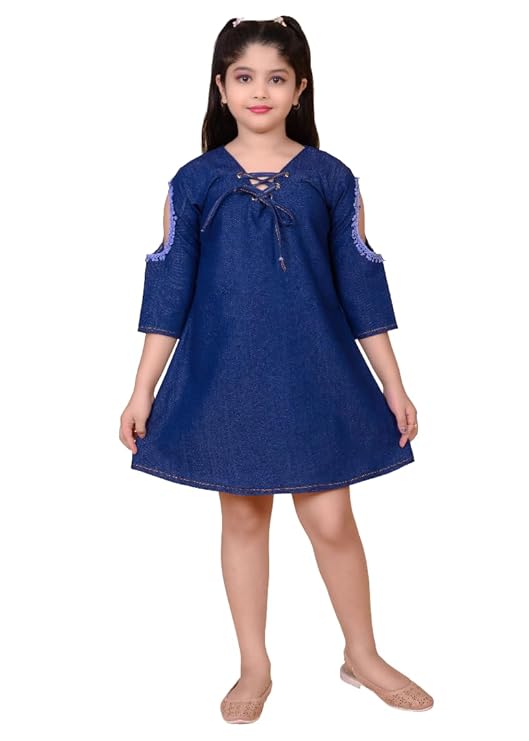 • STYLISH DESIGN: Girls’ blue denim A-line dress featuring trendy cold shoulder sleeves with lace detailing and lace-up front for a fashionable casual look